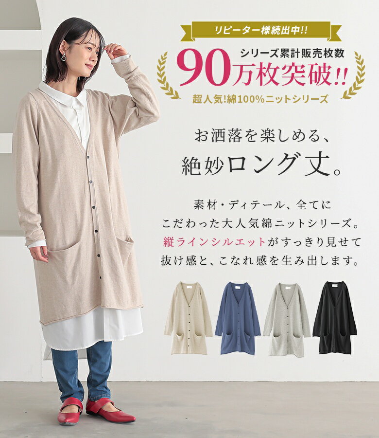 綿100% ロングカーディガン ニット 長袖 大きいサイズ レディース / 着後レビューでクーポン☆ カジュアル ナチュラル シンプル ワイド 体型カバー ゆったり 羽織り トップス 無地 エコロコ オリジナル e+,/ 春 秋 24AW0816R,
